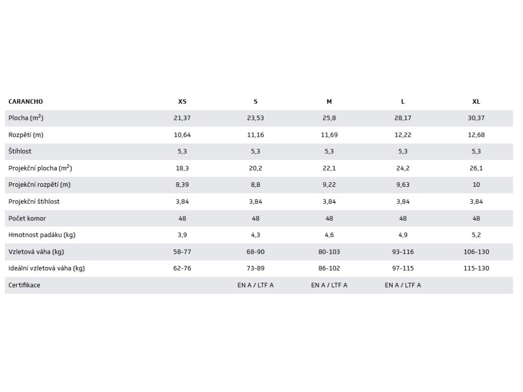 CARANCHO je certifikováno jako křídlo EN-A pro svůj klidný charakter. Se svými parametry, optimalizovaným vývazem, minimalizovaným odporem vzduchu a vynikajícím výkonem má však kluzák skutečnou duši EN-B.